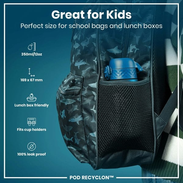 A water bottle fits inside a shark-patterned backpack's mesh pocket; it's designed for kids' school bags and lunchboxes. 350ml/12oz; 169 x 67 mm; lunchbox and cup holder friendly; 100% leak proof. POD RECYCLON™