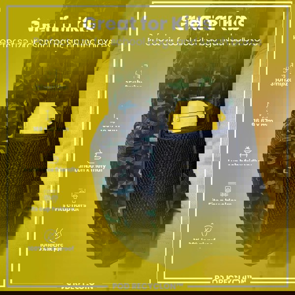 A yellow water bottle, with a full 240° flip lid, is held in a hand. The bottle features a maze design with cartoon snakes. The lid's design ensures a safer drinking experience. POD RECYCLON™