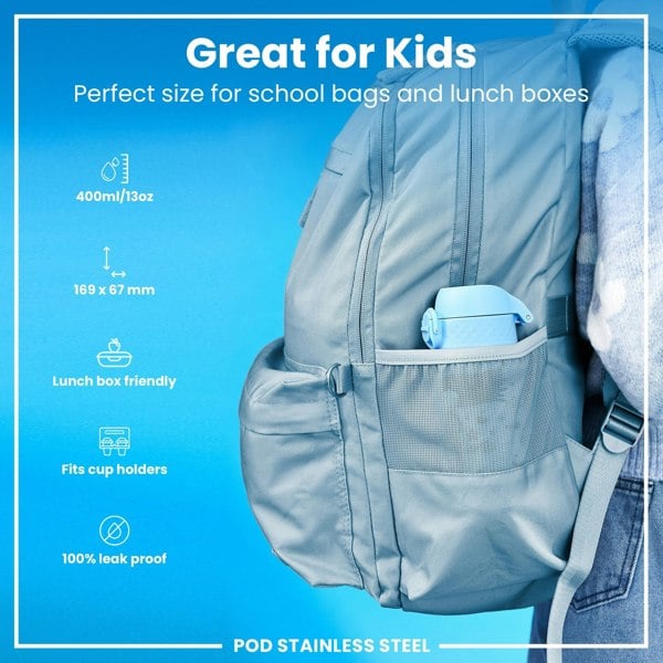 100% leak proof 400ml / 13oz stainless steel water bottles with a smooth flow for spill-free hydration and hygienic full-flip top cover for one handed use on-the-go.