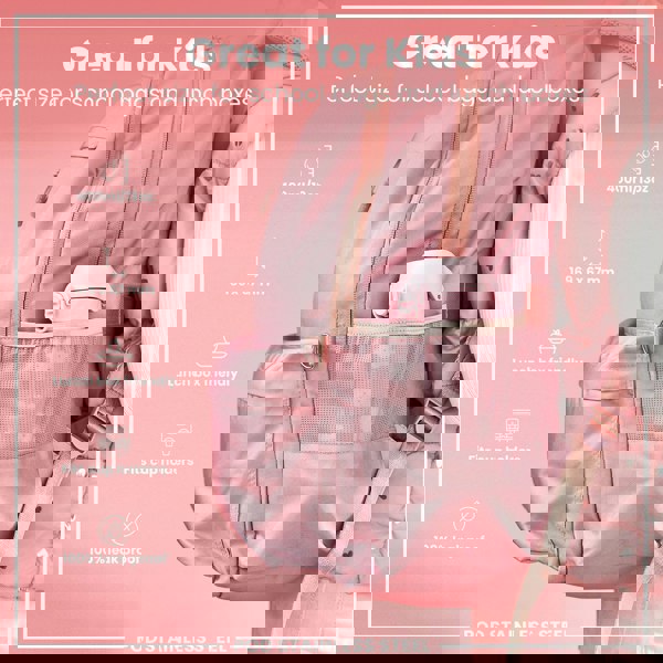 A pink, rainbow-decorated water bottle is held; its flip top opens one-handed. The bottle is made of stainless steel; it’s leakproof and has triple lock security. The background is pink.