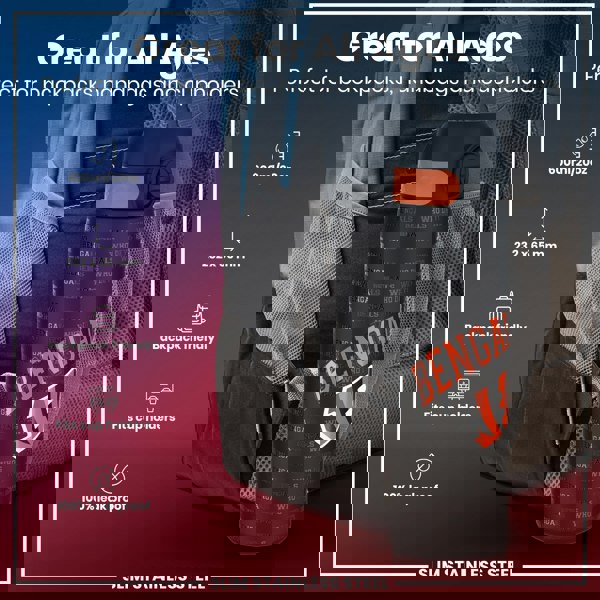 A slim stainless steel water bottle, fitting in a backpack pocket, is shown. The bottle is black with orange accents and "Bengals" and "Who Dey!" text. It's advertised as leakproof and suitable for backpacks, handbags, and cup holders.