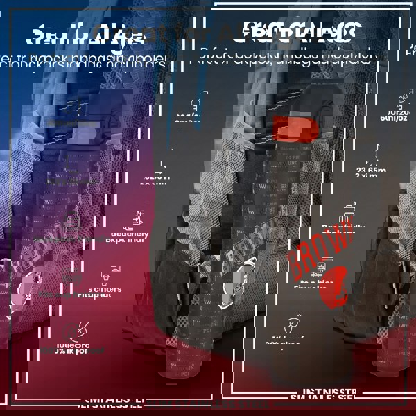A slim stainless steel water bottle, fitting in a backpack pocket, is shown. It's 600ml/20oz, 232 x 65 mm, backpack and cupholder friendly, and 100% leak proof. The bottle's design includes repeated "Dawg Pound Browns" text and a Browns logo.