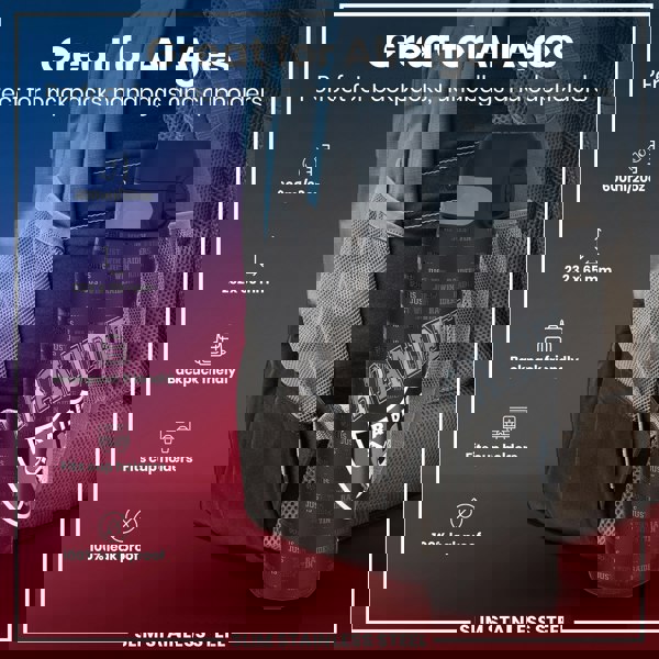 A slim stainless steel water bottle, featuring the Raiders logo and "Just Win" text, is shown nestled in a backpack's side pocket. 600ml/20oz; 232 x 65 mm; backpack and cupholder friendly; 100% leak proof.