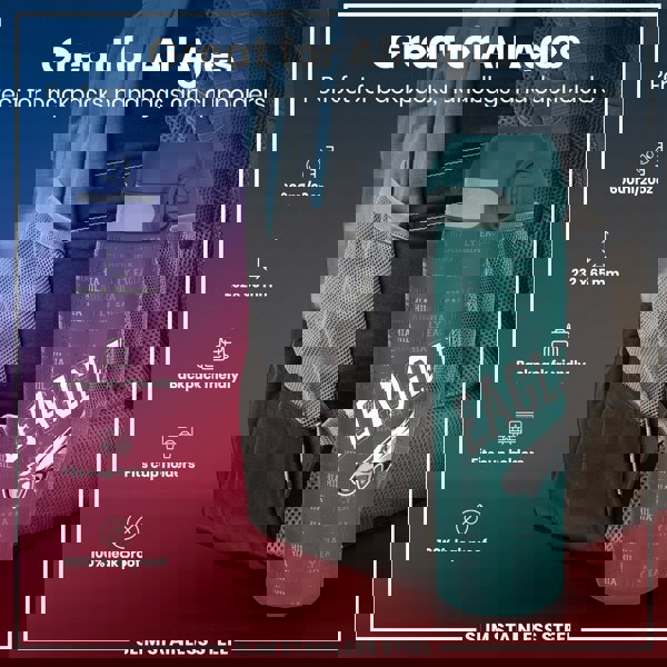 A teal, slim stainless steel water bottle, featuring a Philadelphia Eagles design, sits in a backpack pocket. It's 600ml/20oz, 232 x 65 mm, backpack and cupholder friendly, and 100% leak proof. Great for all ages.