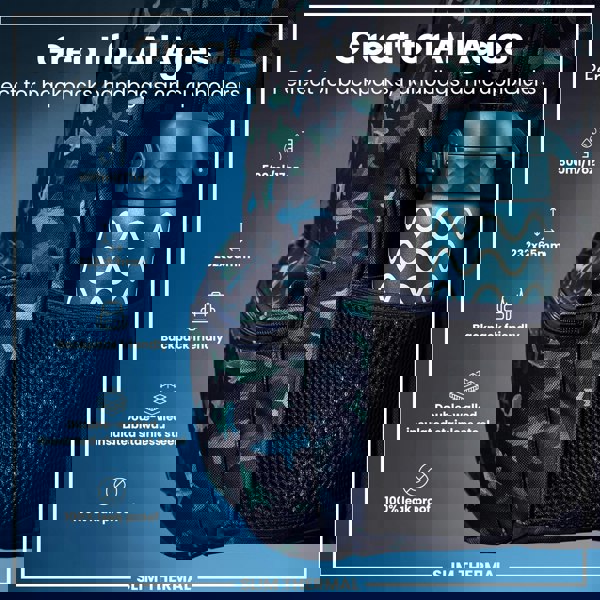 A teal water bottle with a wave pattern is held; its full flip lid opens 240°. The bottle is slim and thermal; the design facilitates easy, on-the-go drinking.