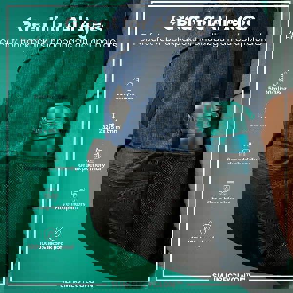 A teal water bottle sits on a white background. It’s made from a plant-based polymer, is BPA-free, odor resistant, and dishwasher safe. The bottle displays measurements in milliliters and ounces.