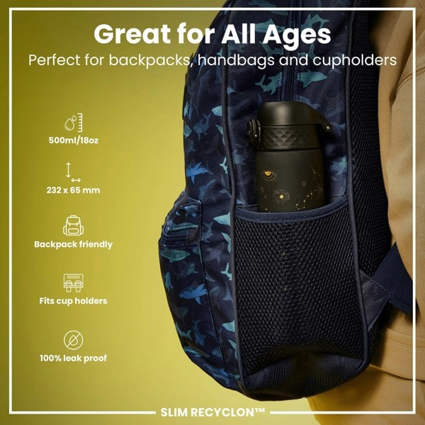 Small enough as a kids water bottle for their school lunch boxes or for smaller bags about town. The width of a soda can, it fits perfectly into all car cup holders and pockets on all backpacks.