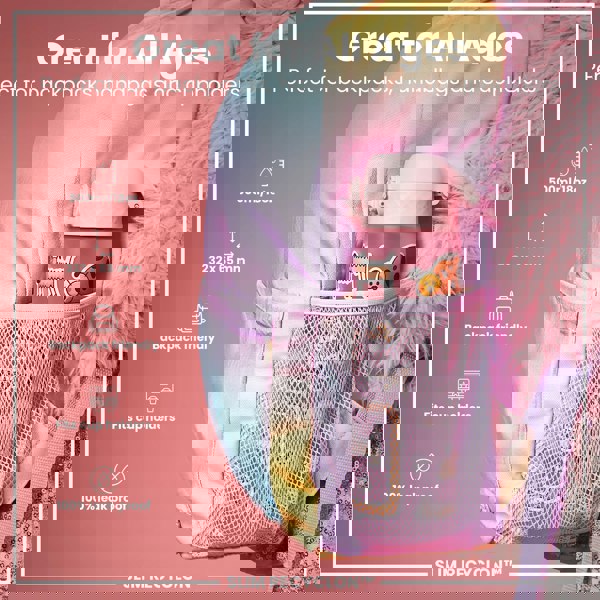 A pink water bottle, featuring a carry handle and dog stickers, is being held against a pink background. Award Winning Design. Hide-Away Carry Handle. No rattles, never in the way. Hygiene Cover. Keeps the spout safe and clean. Crevice Free Design. Designed with hygiene in mind. Wide Opening Mouth. Easy clean, easy refills. GERMAN DESIGN AWARD WINNER 2024. GOOD DESIGN. 2021. SLIM RECYCLON™.