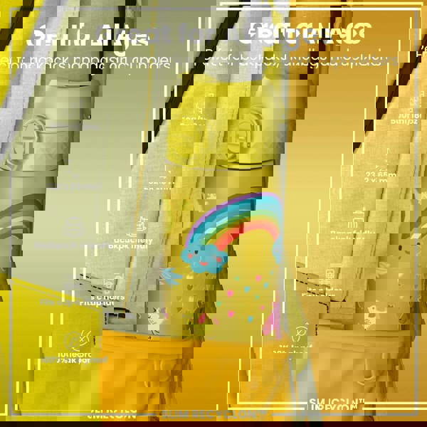 Small enough as a kids unicorn water bottle for their school lunch boxes or for smaller bags about town. The width of a soda can, it fits perfectly into all car cup holders and pockets on all backpacks.