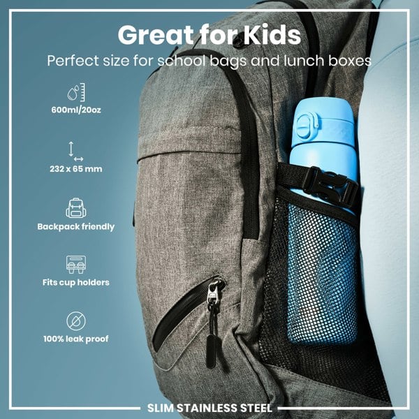 100% leak proof 600ml / 20oz stainless steel blue water bottle with a smooth flow for spill-free hydration and hygienic full-flip top cover for one handed use on-the-go.