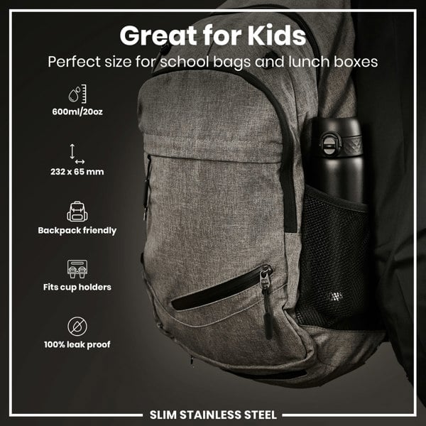 100% leak proof 600ml / 20oz stainless steel black water bottles with a smooth flow for spill-free hydration and hygienic full-flip top cover for one handed use on-the-go.