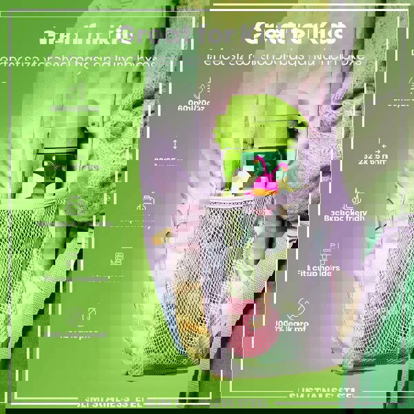 A green water bottle, featuring cartoon insects, stands upright against a white background.