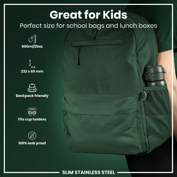 100% leak proof 600ml / 20oz stainless steel green water bottle with a smooth flow for spill-free hydration and a hygienic full-flip top cover for one handed use on-the-go.