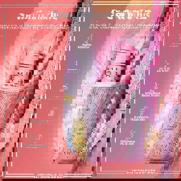 A pink, patterned water bottle fits inside a pastel-colored backpack's mesh pocket. It's 600ml/20oz, 232 x 65 mm, backpack and cup holder friendly, and 100% leak proof. Great for kids.