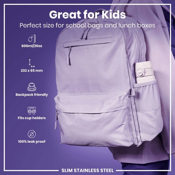 100% leak proof 600ml / 20oz stainless steel water bottles with a smooth flow for spill-free hydration and hygienic full-flip top cover for one handed use on-the-go.