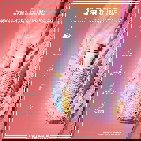 A pink water bottle fits inside a pastel backpack's mesh pocket. It's 600ml/20oz, 232 x 65 mm, backpack friendly, fits cup holders, and is 100% leak proof. Great for kids.