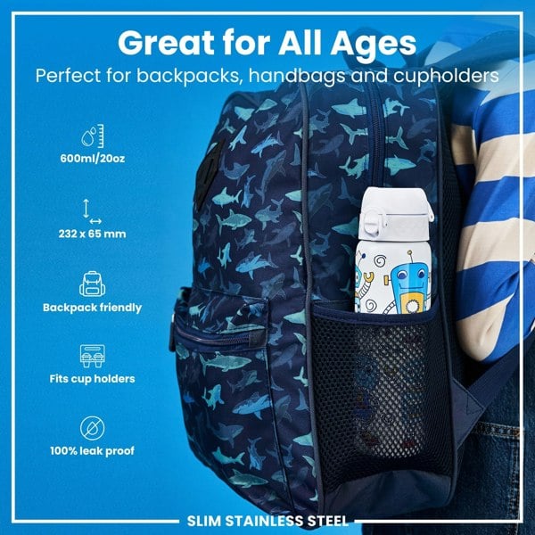 ION8 Leak Proof Slim Water Bottle, Stainless Steel, Robots, 600ml (20oz)