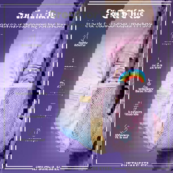 A pastel-colored, rainbow-decorated water bottle fits inside a pastel-colored backpack's mesh pocket. The bottle is 600ml/20oz, 232 x 65 mm, backpack and cup holder friendly, and 100% leak proof. It is slim and made of stainless steel.