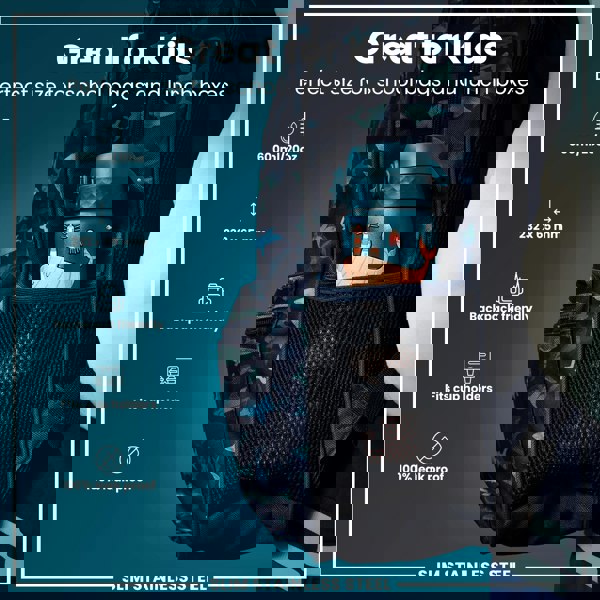 A teal water bottle, fitting in a backpack's mesh pocket, is shown against a teal background. "Great for Kids," "Perfect size for school bags and lunch boxes," "600ml/20oz," "232 x 65 mm," "Backpack friendly," "Fits cup holders," "100% leak proof," and "SLIM STAINLESS STEEL" are also shown.