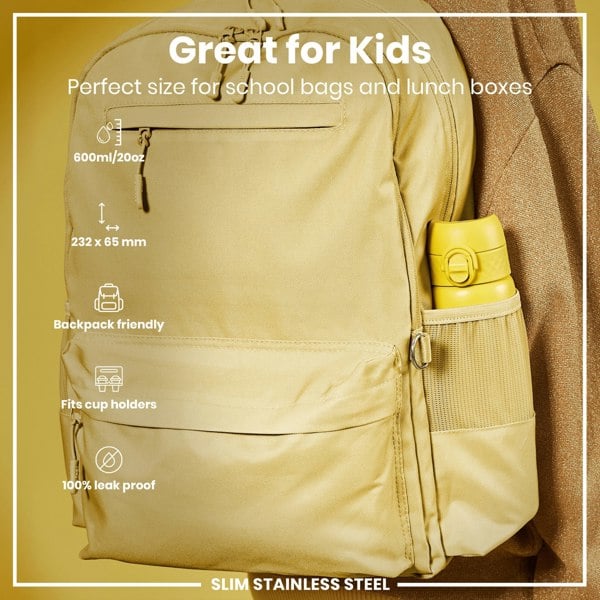 100% leak proof 600ml / 20oz stainless steel yellow water bottle with a smooth flow for spill-free hydration and hygienic full-flip top cover for one handed use on-the-go.