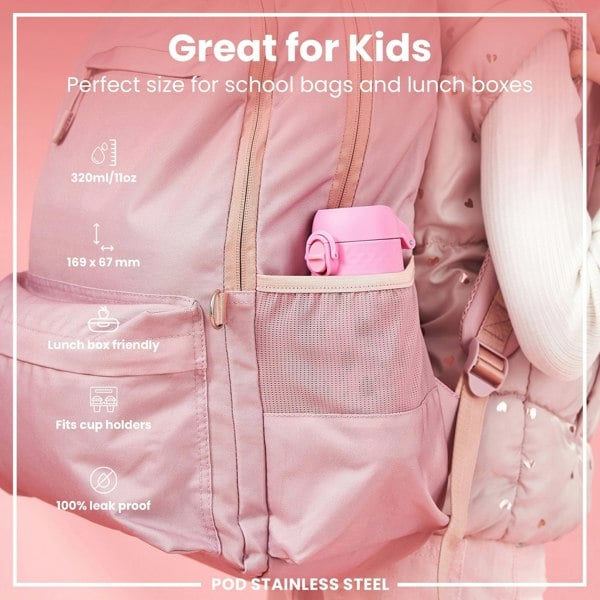 The perfect replacement for single use disposable cups. Small enough as a kids water bottle for their school lunch boxes or for smaller bags about town. The width of a soda can, it fits perfectly into all car cup holders and pockets on all backpacks.