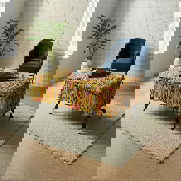 Lift the hinged lid to reveal a deep storage compartment, ideal for keeping everyday items neatly out of sight. High-density foam adds supportive comfort, allowing it to double as extra seating when needed, while a solid wood frame and robust black legs provide stability for everyday use. Handcrafted in the UK, each ottoman features an individual pattern that makes every piece feel distinctive.