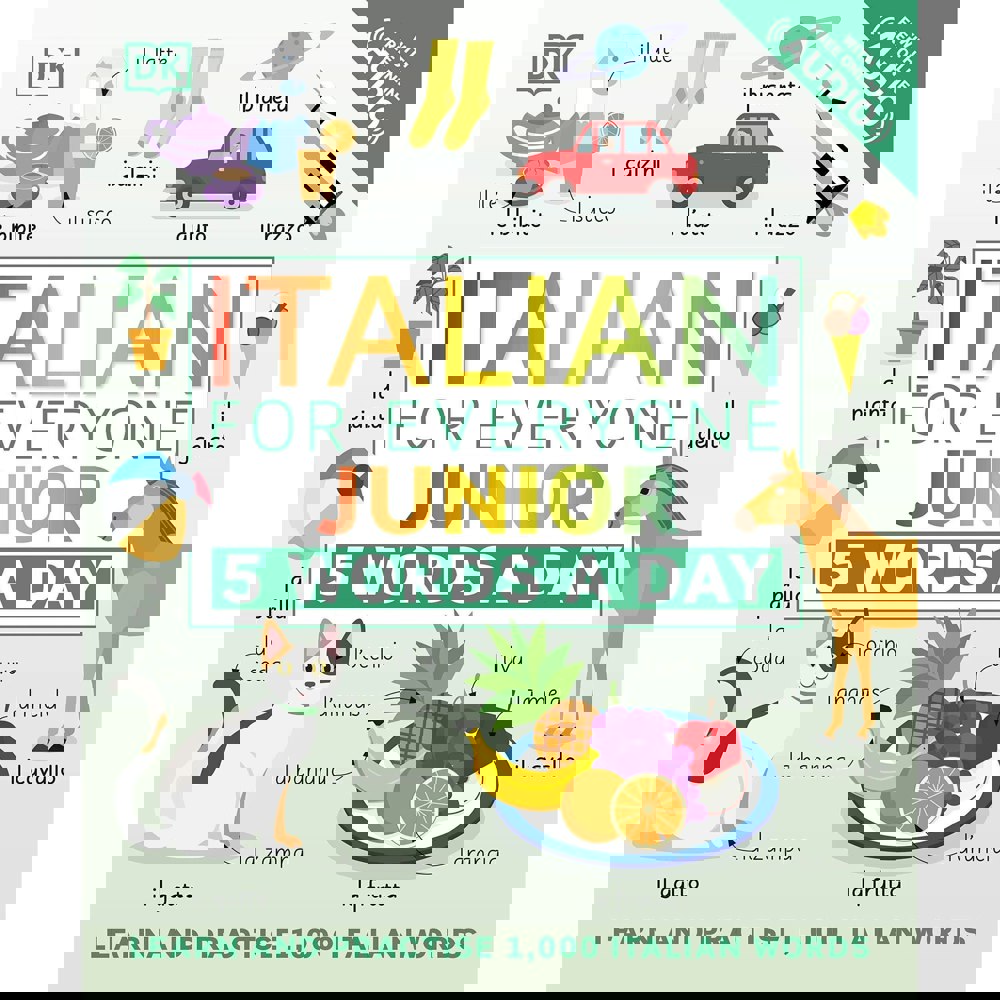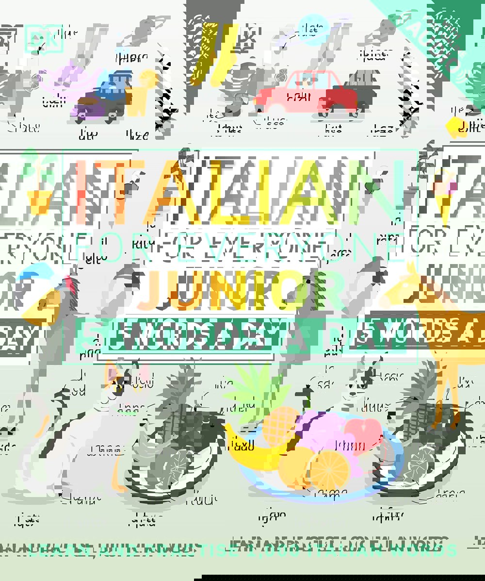 Italian for Everyone Junior 5 Words a Day: Learn and Practise 1,000 Italian Words is an Italian workbook for beginners designed to help children build vocabulary in manageable steps. Aimed at ages 6–9, it introduces new language five words at a time, supporting steady progress across the year.