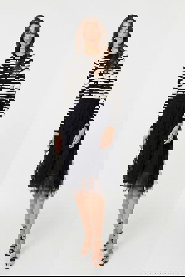 This dress gives the illusion of a knit top and a skirt in one. The bodice is made from a comfortable viscose blend with button details and long sleeves - and the high waisted skirt is made from semi sheer mesh. It has a hanky hem that will move as you do for a fun and playful look.