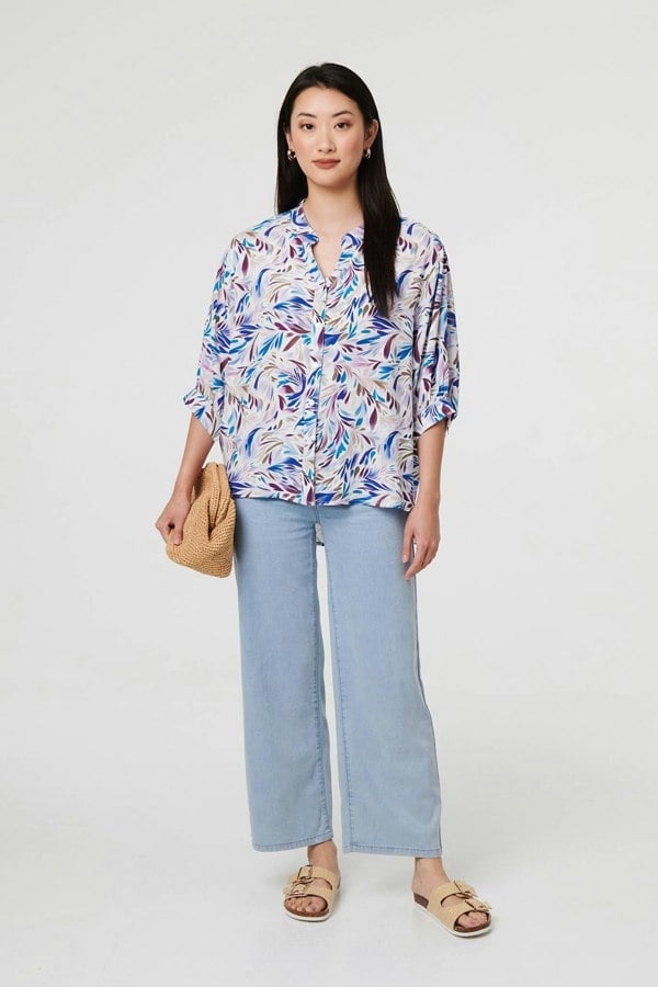 Dress for both work and the weekend with this button front shirt. It's simple-yet-stylish; with a collarless v-neck, a curve hem and 3/4 sleeves. Fasten the buttons on the front or leave them undone over a vest for a relaxed look.