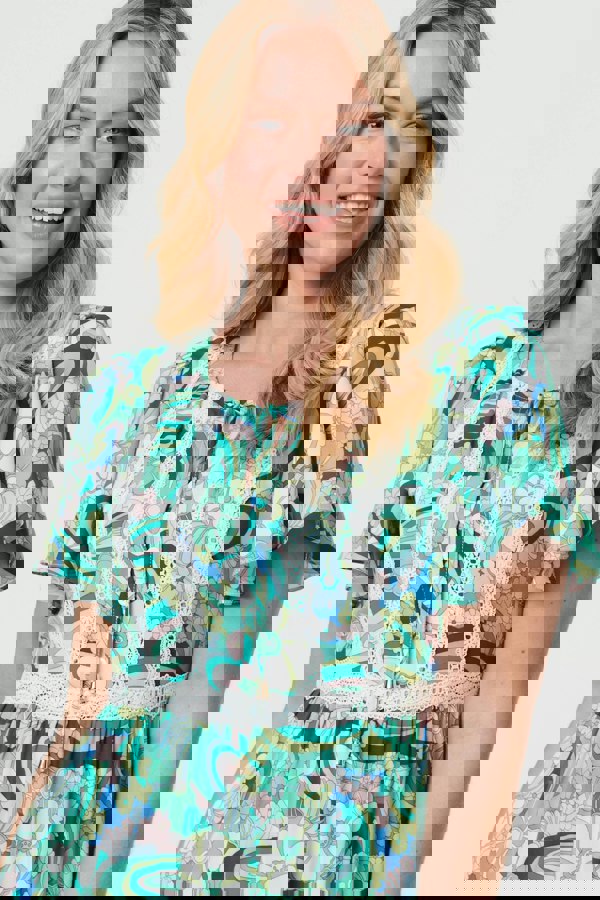 Tap into the midi dress trend with this beautiful style. It has lace trims and a tie up round neck, along with buttons on the front. The angel sleeves will cover the tops of your arms and the shirred waist will flatter your figure, whether you're dressing up for a special occasion or for a day at work.