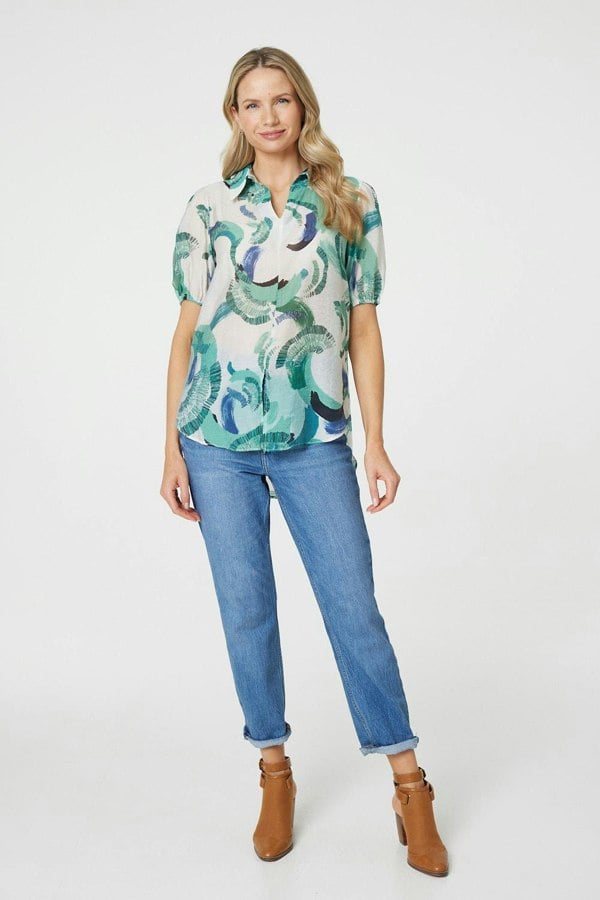 If you're headed to work or enjoying a laid-back day off, this blouse is your perfect choice. It has a comfortable v-neck with a collar and short puff sleeves, along with a relaxed fit. We love this blouse with some blue jeans, or you can elevate the look with smart trousers and heels for a more formal look.