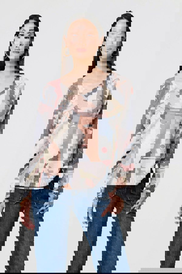 Make a statement in this abstract face printed knit jumper. With a v-neck, long sleeves, a slouchy fit and a hip length hem. Style with mid-wash denim and tan boots for a laid-back daytime outfit or elevate with a faux leather skirt and heeled boots for the office.