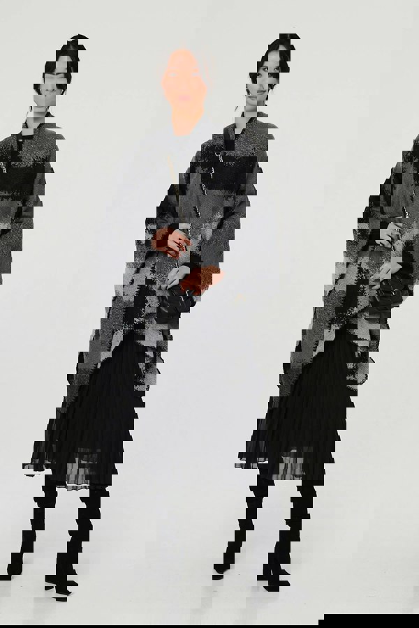 Make a cosy statement in this abstract printed poncho. With an open front, a soft texture, a blanket stitch finish and a thigh length hem. Layer over a high neck knit dress with knee high boots and tights for a chic yet cosy office look.