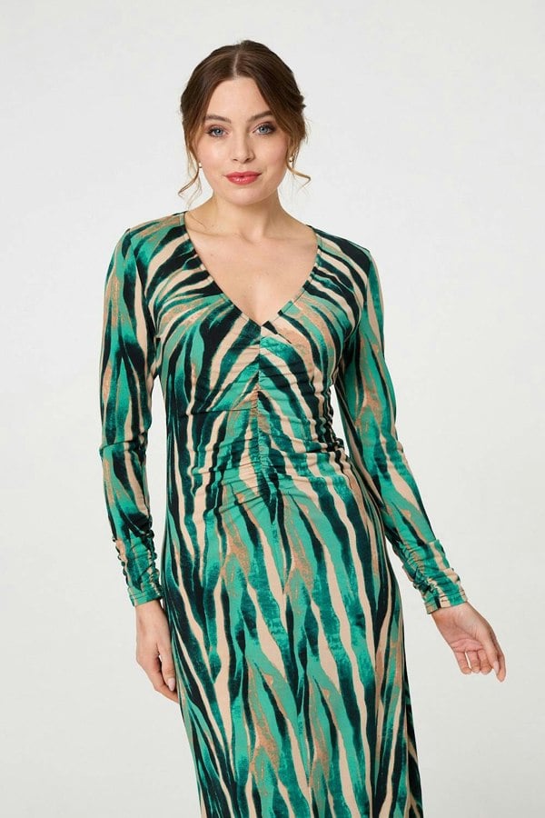 This elegant dress has a midi length hem and a flattering ruched bodice. The tummy-flattering bodycon fit and v-neck will look beautiful on all figures. Wear this dress with your favourite heels for a special occasion.