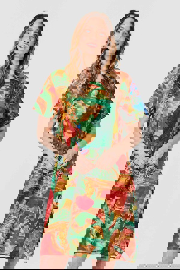 Add a bold printed shift dress to your closet with this watercolour print style. With a round neck, short sleeves, pockets and a knee length skirt. Style with flat sandals for an effortlessly comfortable outfit.
