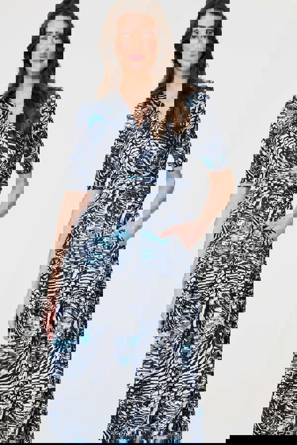 Dress for a casual yet stylish occasion in this beautiful dress. It has a v-neck and 1/2 sleeves, with a tummy-flattering pleated front. The ruched waistband has a wrap dress look that will slim your figure too. Wear this dress for a daytime outfit with plain trainers, or style with smart shoes for evening plans.