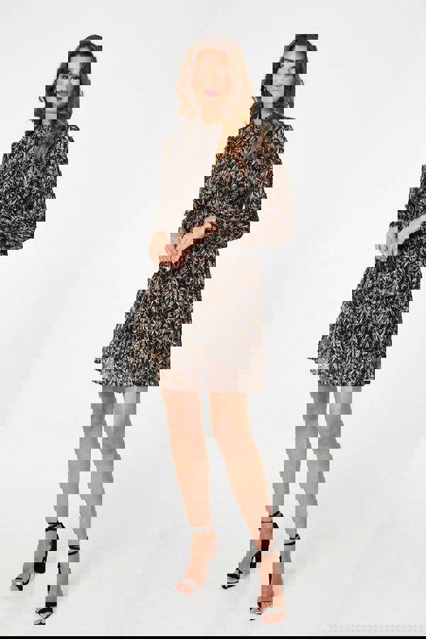 This flattering skater dress has a beautiful mesh layer that will float elegantly as you move. It has long sleeves, a high neck and a short length hem. The sleeves are semi sheer with a relaxed puff shape. Wear this dress with heels for a flattering look at your next special occasion.