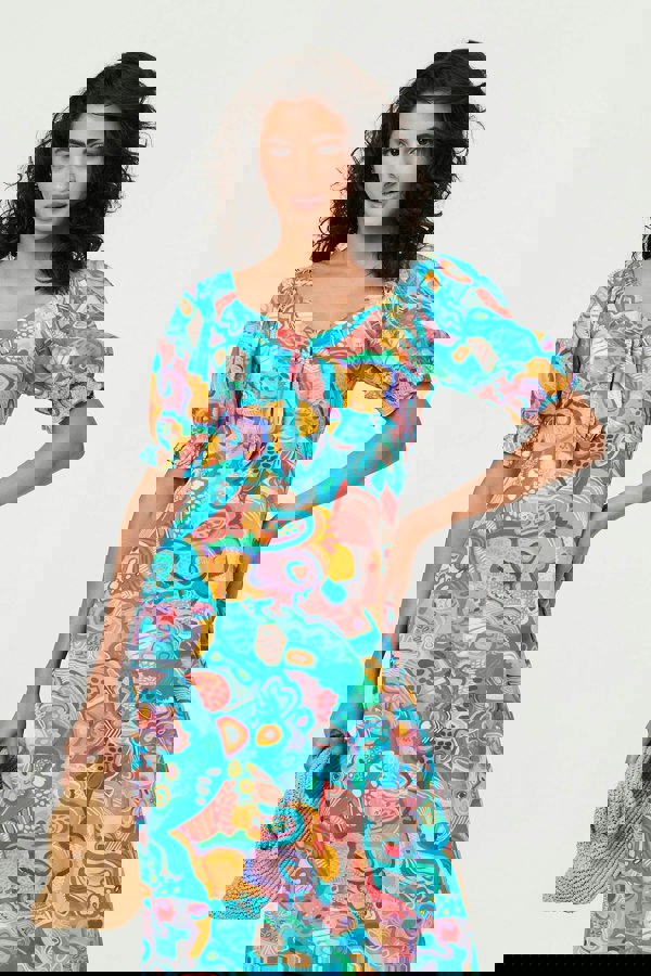 This elegant midi dress has short puff sleeves and a sweetheart neck. The front features an eye-catching tie detail, and the skirt has a slightly flared fit for a tummy-flattering look. Pair this midi dress with strappy heeled sandals for summery formal events.