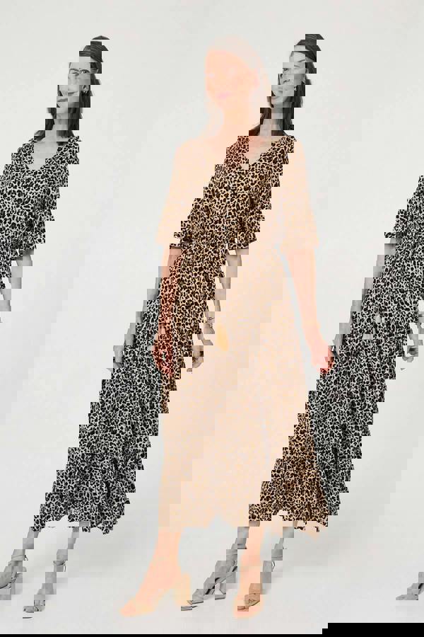 Animal print will always look fabulous, and this beautiful maxi dress is no exception! It has a floaty tiered shape, 1/2 flared sleeves and a classic v-neck. Get the perfect fit around your figure with an adjustable drawstring waist, complete with tassel tie details.