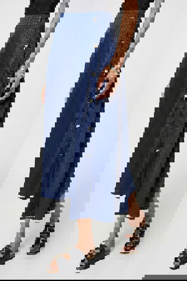 This elegant skirt has a silky satin texture with a flattering a-line cut. It fastens with button details and has a high waist fit, with a midi length hem. Tuck your favourite t-shirt, top or jumper into the waistband for an elevated casual look.