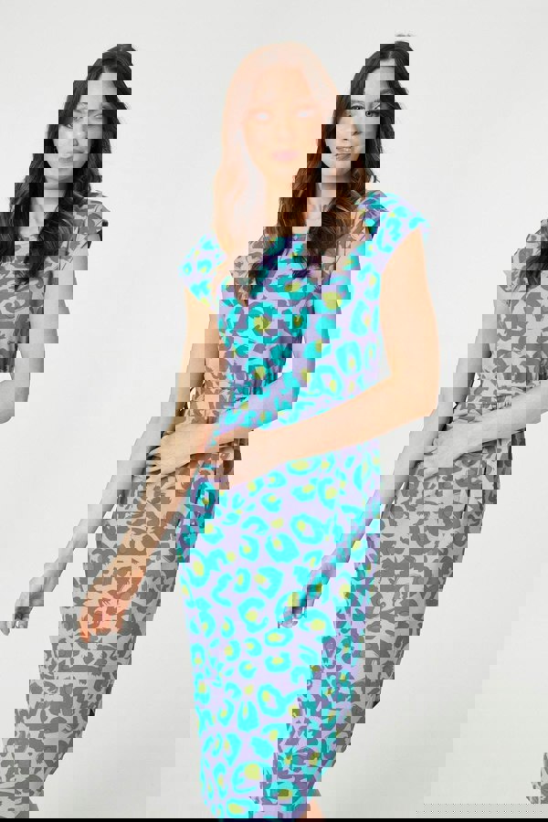 Add a vibrant colour pop to your new season closet with this animal print jersey dress. With a round neck, cap sleeves, a self-tie belt, a midi skirt and a curved hem. Style with trainers for a casual and comfortable daytime outfit.