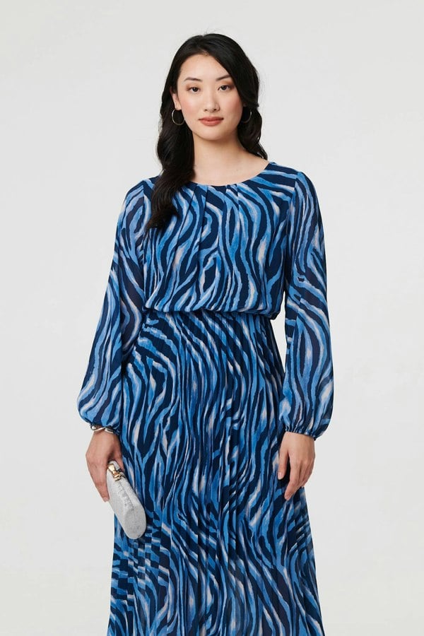 This beautiful maxi dress is perfect for special occasions. It is made from a semi sheer material and has a pleated texture, with a lining underneath. It also has long sleeves, an elasticated waist and a midi length hem. Style with your favourite heels and a clutch bag for a special occasion.