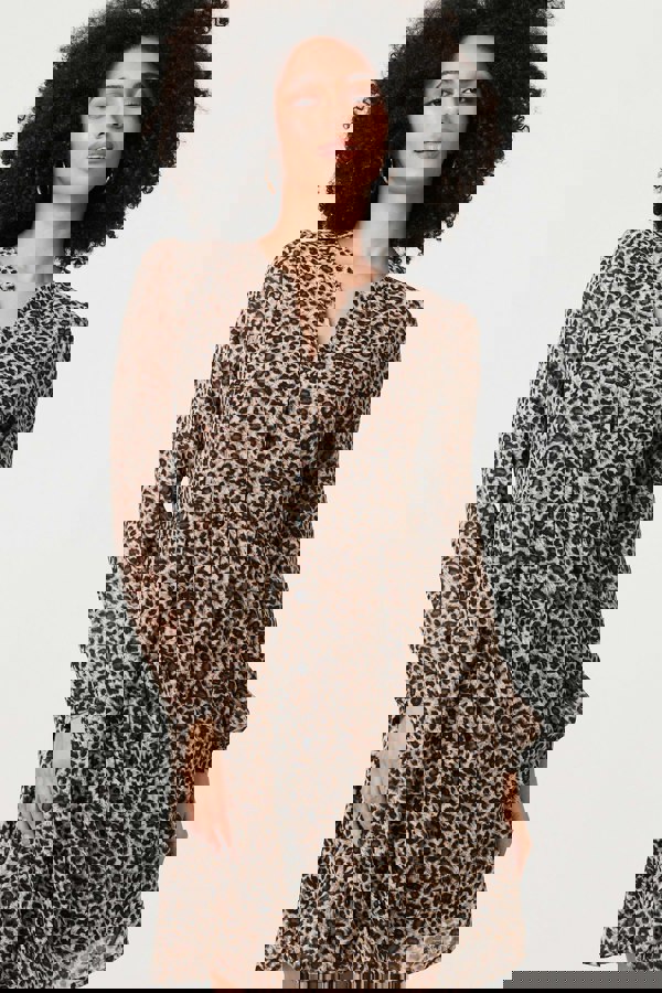 Every wardrobe needs some animal print! This short dress ticks all the boxes with a glamorous v-neck, long puff sleeves and an elegant a-line shape. It also has buttons and pleats on the front. The short length hem will flatter your figure, whether you pair with black tights and boots, or just sandals in the summer.