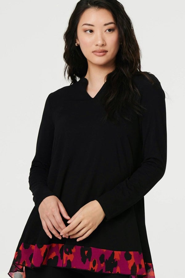 This smart blouse is made from a semi sheer material and has a relaxed, drapey shape. It also has long sleeves, a v-neck and a thigh length hem. Wear it over slim trousers or leggings for a smart look, or layer over blue jeans for a relaxed outfit.