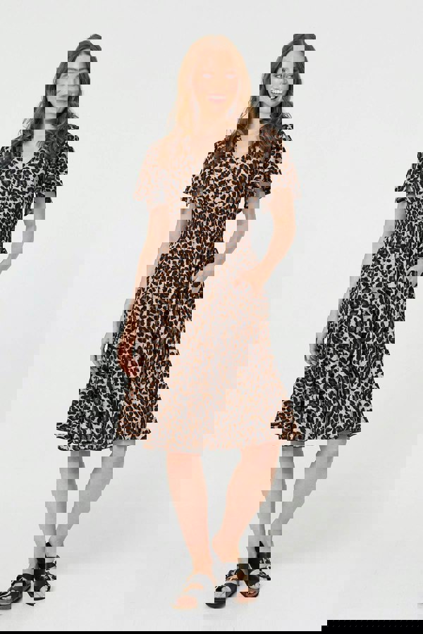 This knee length dress has a tummy-flattering shirred waist, with buttons and a classic v-neck. It has short angel sleeves and a knee length hem, giving a feminine yet reserved look. Wear it for a special occasion with some sparkly accessories, or style with a denim jacket and trainers for a relaxed outfit.