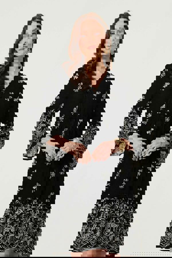 Dress for warm weather in style in this flattering short dress. It has a relaxed fit, 3/4 sleeves and a tiered floaty skirt. The v-neck features a beautiful lace trim and a tie front finish. Wear this short dress with trainers for a relaxed day out and about.
