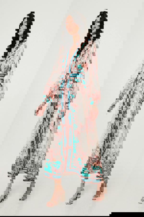 Dress for your next special occasion in this beautiful maxi dress. It has a v-neck, a row of buttons on the front, and a flattering a-line shape that flares out around the waist. The long sleeves have a balloon shape, and this dress even has hidden pockets! Wear it with simple heels for your next wedding or evening plans.