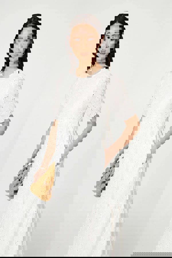 Izabel London brings a relaxed option for warm-weather dressing with the Broderie Anglaise Tiered Midi Dress. Cut in a tiered shape, it has a soft Broderie Anglaise material and a lining underneath for added coverage. A round neckline and short puff sleeves keep the look light and easy, while the midi-length hem creates a balanced silhouette suited to everyday plans.