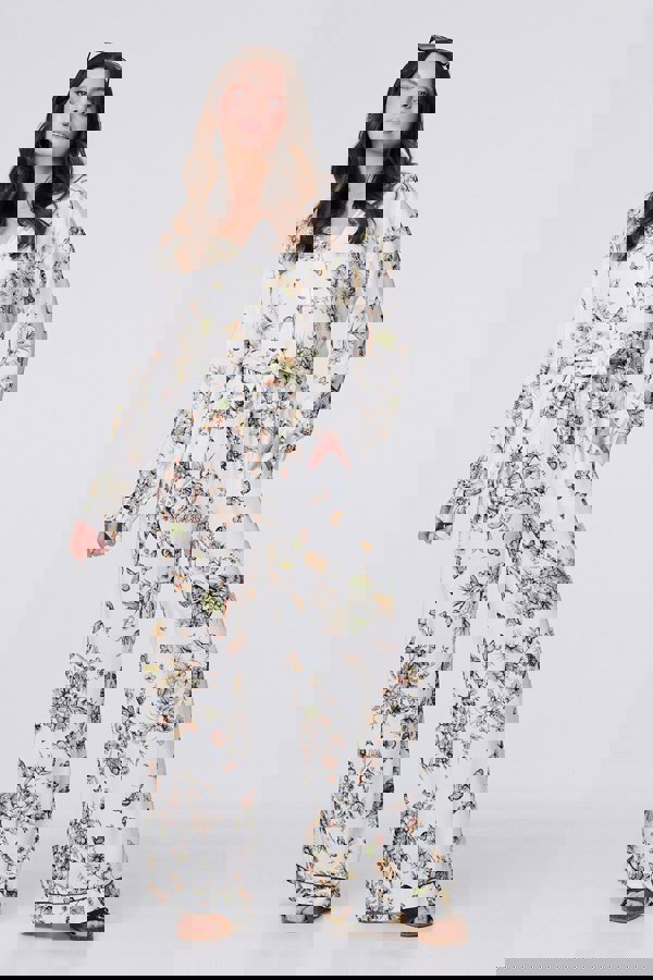 Make a statement in this botanical print relaxed shirt. With a v-neck, collar, long sleeves with a frilled cuff, a tie detail hem and a cropped fit. Style with the matching butterfly printed trouser for a head-to-toe outfit or pair with a denim maxi skirt and flat sandals for a casual weekend outfit.