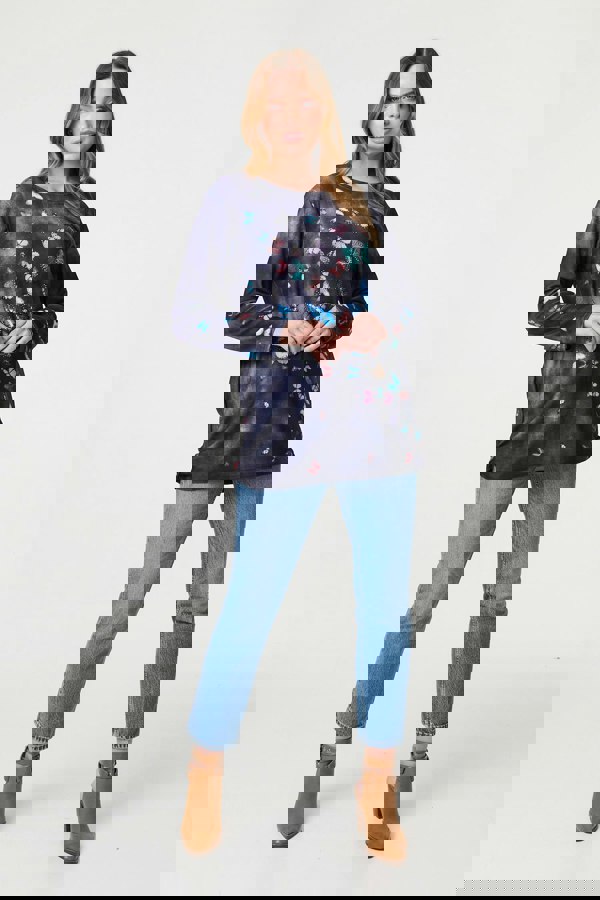 Add a fun printed jumper to your closet with this butterfly print jersey top. With a round neck, long sleeves, a loose fit and a longline hem sitting below the hips. Layer over denim jeans and trainers for an effortlessly comfortable weekend outfit.